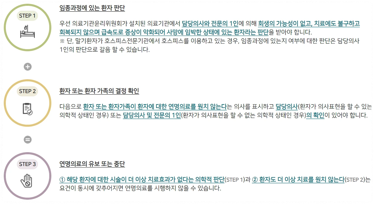 - 의료진이 치료 효과가 없다는 의학적 판단을 내리고, 환자 또는 가족의 동의가 있어야 가능\